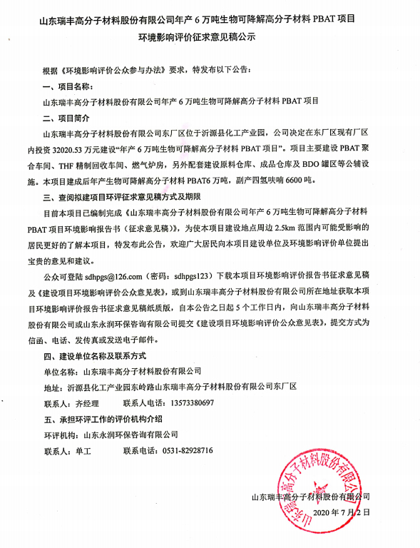 山東瑞豐高分子材料股份有限公司年產(chǎn)6萬噸生物可降解高分子材料PBAT項(xiàng)目環(huán)境影響評(píng)價(jià)征求意見稿公示